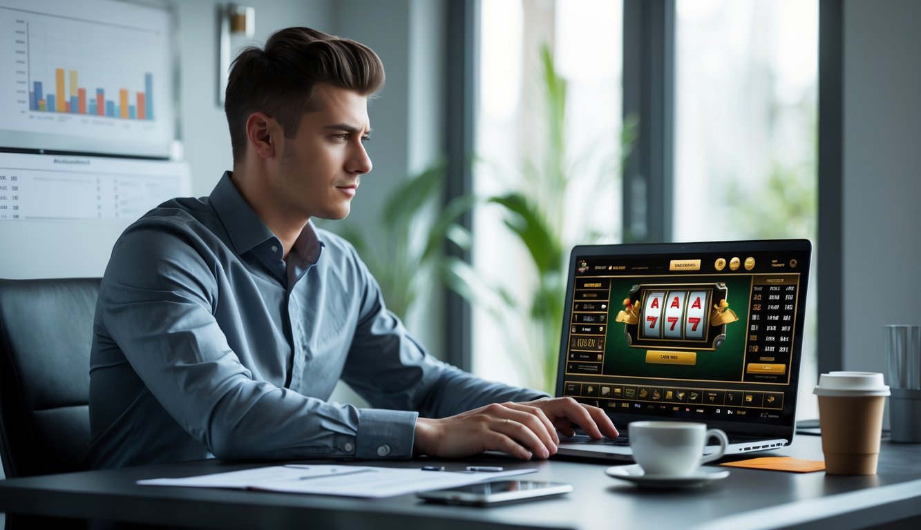 Seorang pria muda duduk di meja dengan laptop yang menampilkan permainan slot online, terlihat fokus dan serius dalam suasana ruangan yang terang dan rapi.
